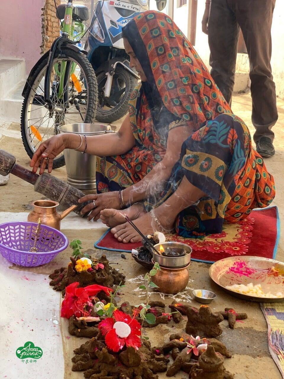 既然牛的一切都是神聖的,而牛糞容易取得又易塑形,所以牛糞在宗教儀式上扮演著很重要的角色,有很多儀式的物品都是以牛糞做為原材料所製成的。例如:在侯麗節 Holi 用的火種杯就是阿嬤用牛糞一個個捏出杯子形狀的物件;不過當然最值得一提的牛糞物件,當然就是侯麗節當天的傳統「便便魔法陣」。